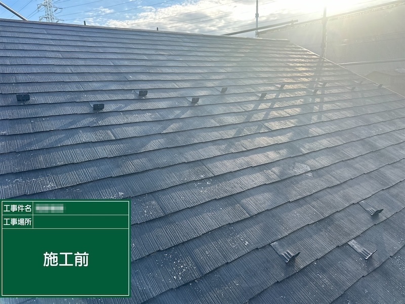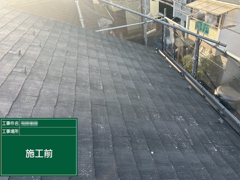 屋根材はスレートになっており、経年劣化から塗膜の剥がれや汚れ、コケの付着などがありました。