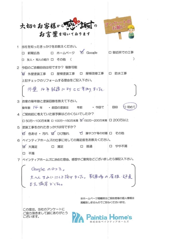 外壁が14年経過しており、ヒビなどもあったため、ペインティアホームズさんに工事をお願いしました。